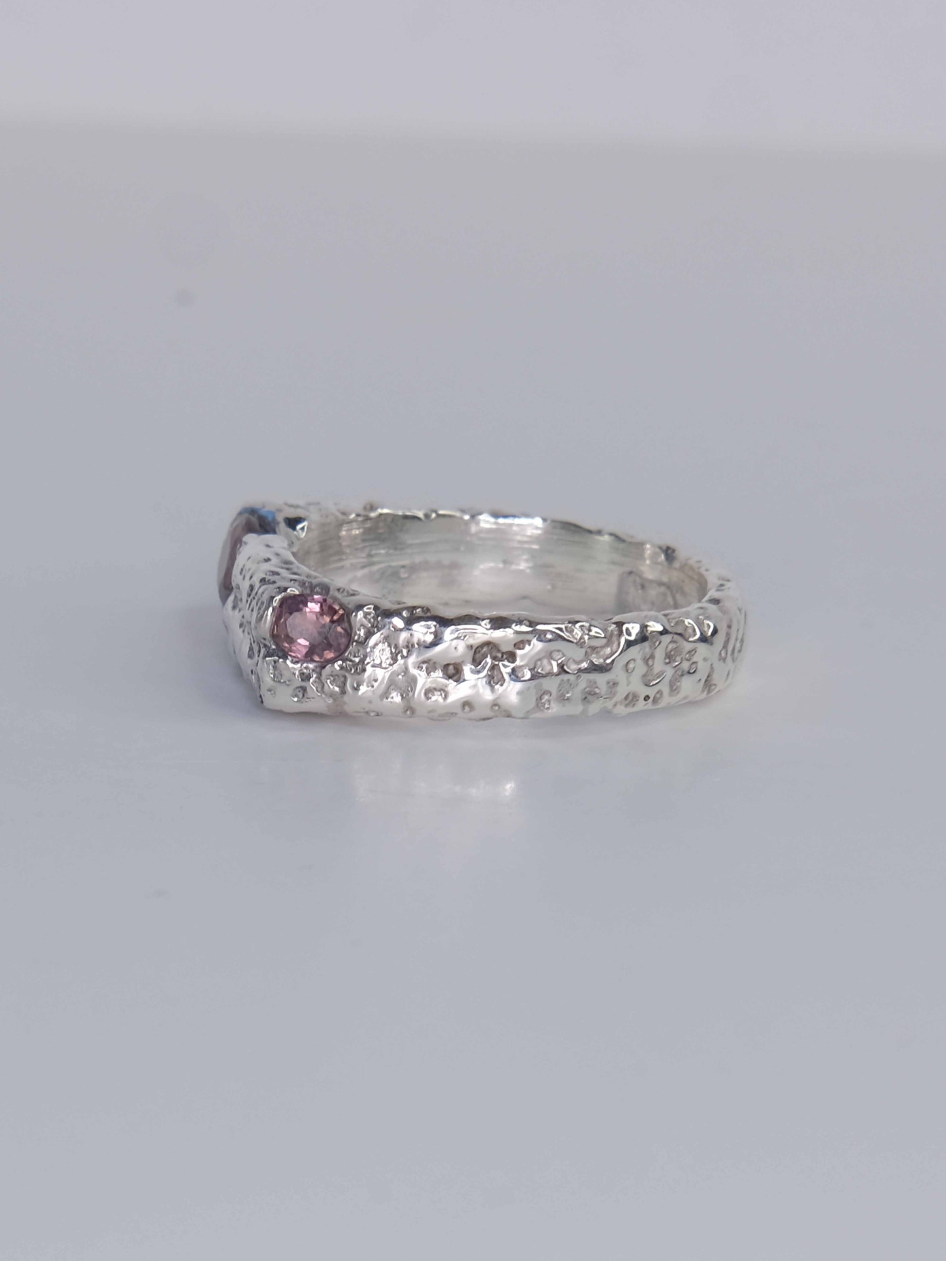 Dune signet ring capturing the structure of shiftings sands - cast in 925 sterling silver with pink/brown center sapphire.